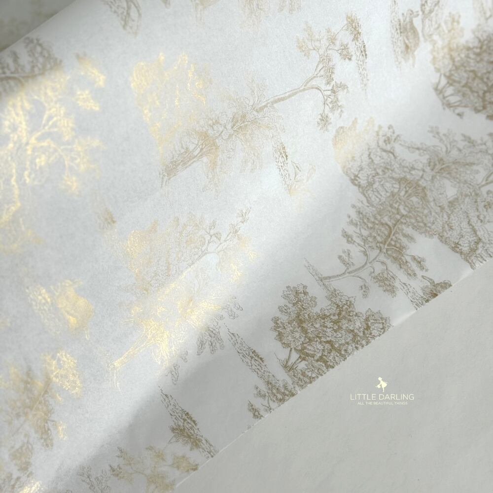 花束の中紙としてもお使いいただける薄さです。ロングセラーのデザインで、片面印刷で40枚が1セットです。繊細に表現されたゴールドカラーがより上品に表現されました。 ギフトラッピングの際、中紙として使ってもいいです。 写真を参考にしてご活用ください。